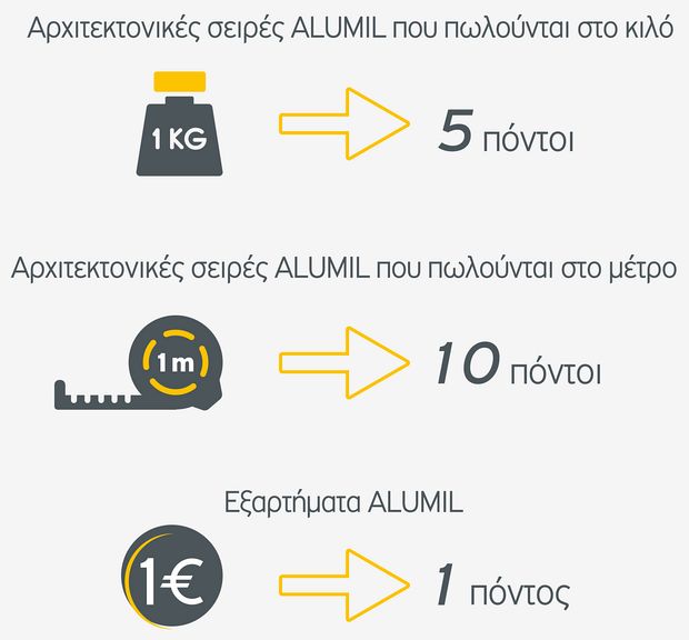 Έχει διαμορφωθεί ένα σύστημα πόντων το οποίο ισχύει για όλους όσους συμμετέχουν στο πρόγραμμα “ALUMILIA” και το οποίο διαμορφώνεται ως εξής: